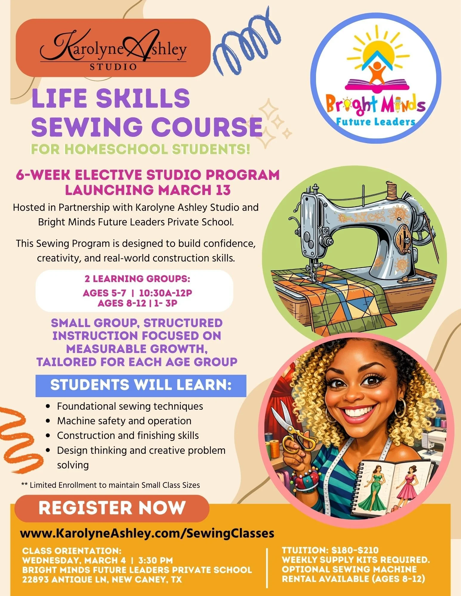 • Semester sewing electives for enrolled Bright Minds students